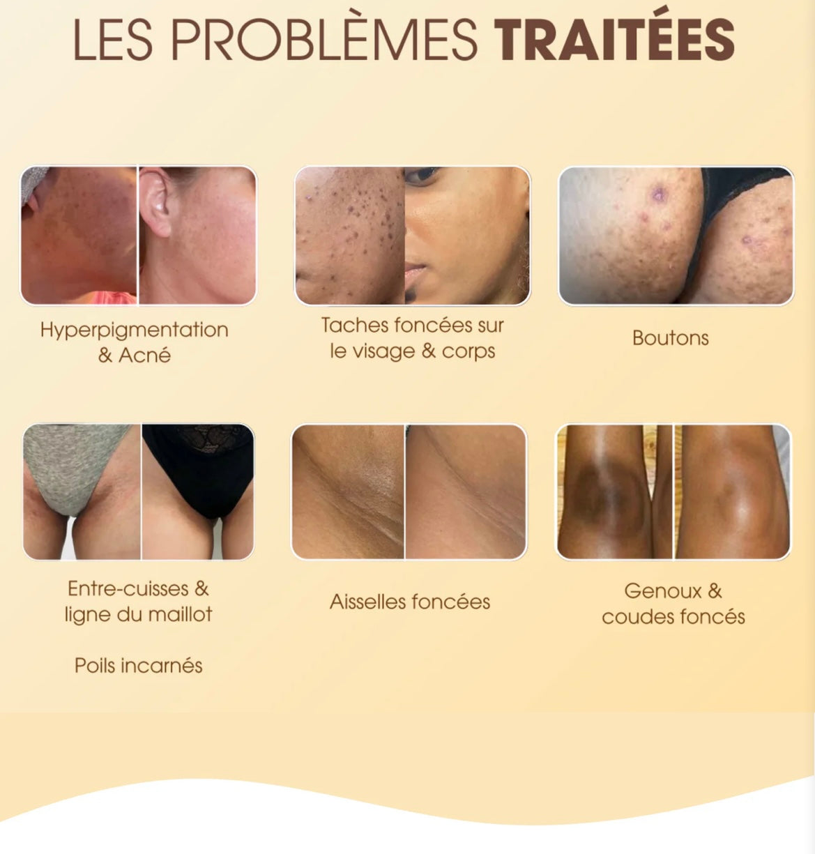 I nostri prodotti sono efficaci sulle zone soggette a iperpigmentazione come il viso, le ascelle, le ginocchia, i gomiti, l’inguine o anche la schiena. Il sapone e i trattamenti idratanti sono pensati per uniformare l’incarnato dalla testa ai piedi.