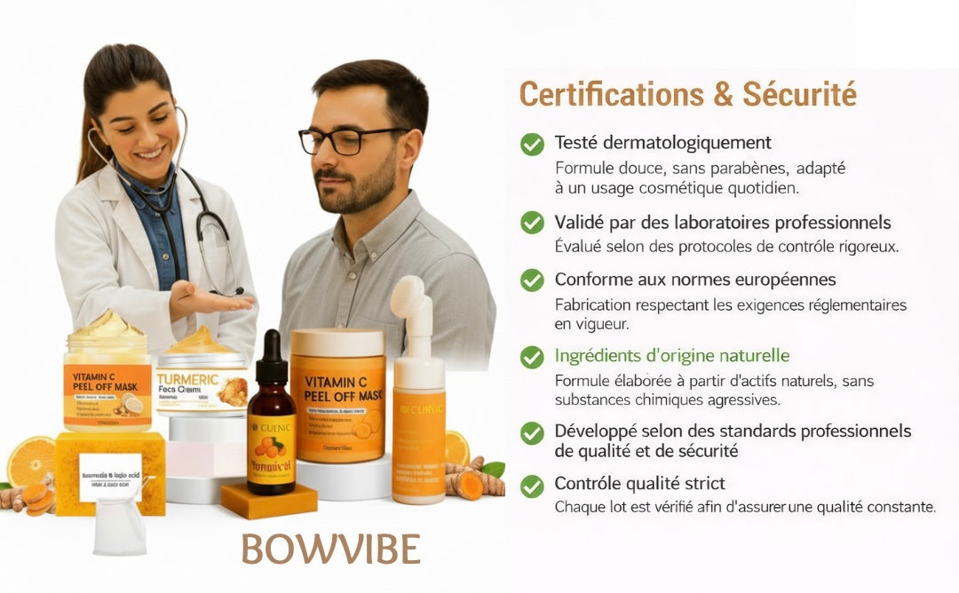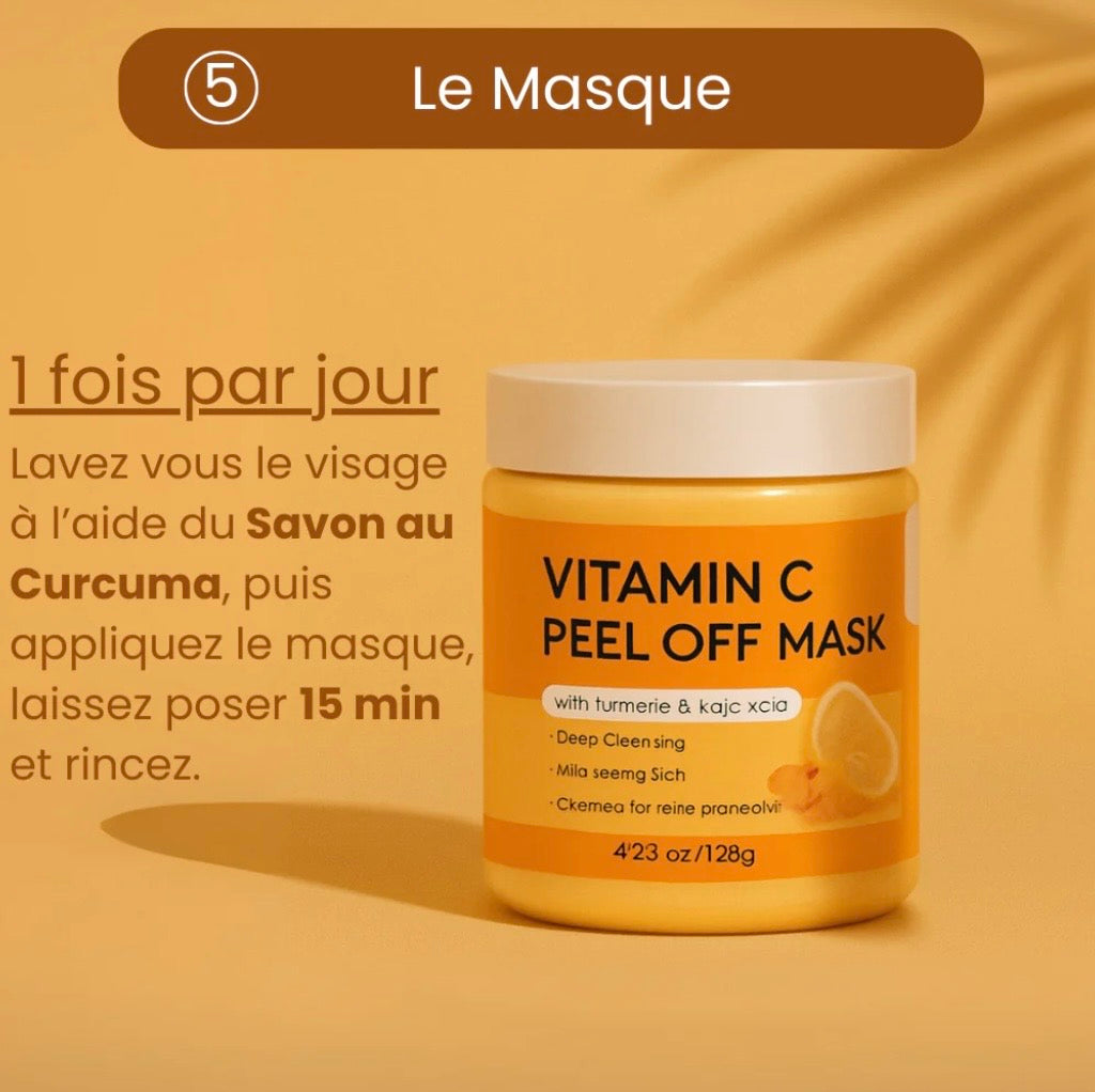 - Masque Peel-Off Vitamine C & Curcuma – élimine les impuretés, réduit les taches et affine le grain de peau.